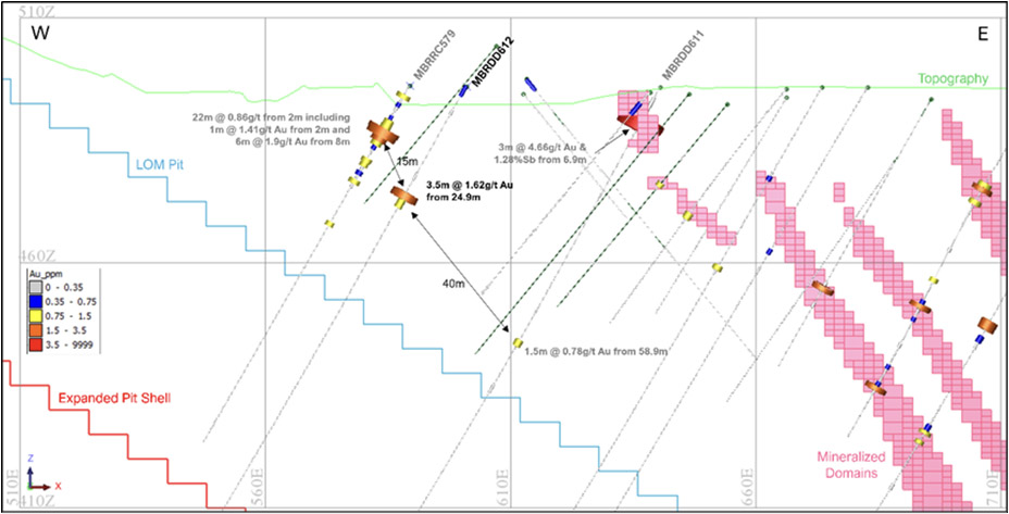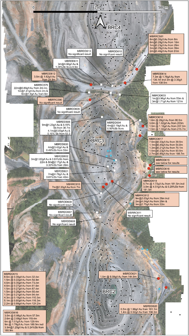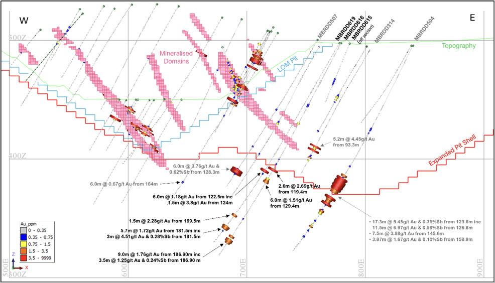 | 4 | MBRDD619: | 5.7m @ 1.72g/t Au from 181.5m including 3.0m @ 4.51g/t Au & 0.28%Sb from 181.5m |