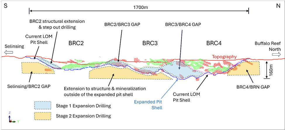 Stage 1 Buffalo Reef/Felda Expansion drilling program focuses on evaluation of the potential resource increase to bridge the gaps between BRC2/BRC3 and between BRC3/BRC4 (Figure 2), to enable the pits to be combined and expanded, which may inform future LOM planning subject to further studies.