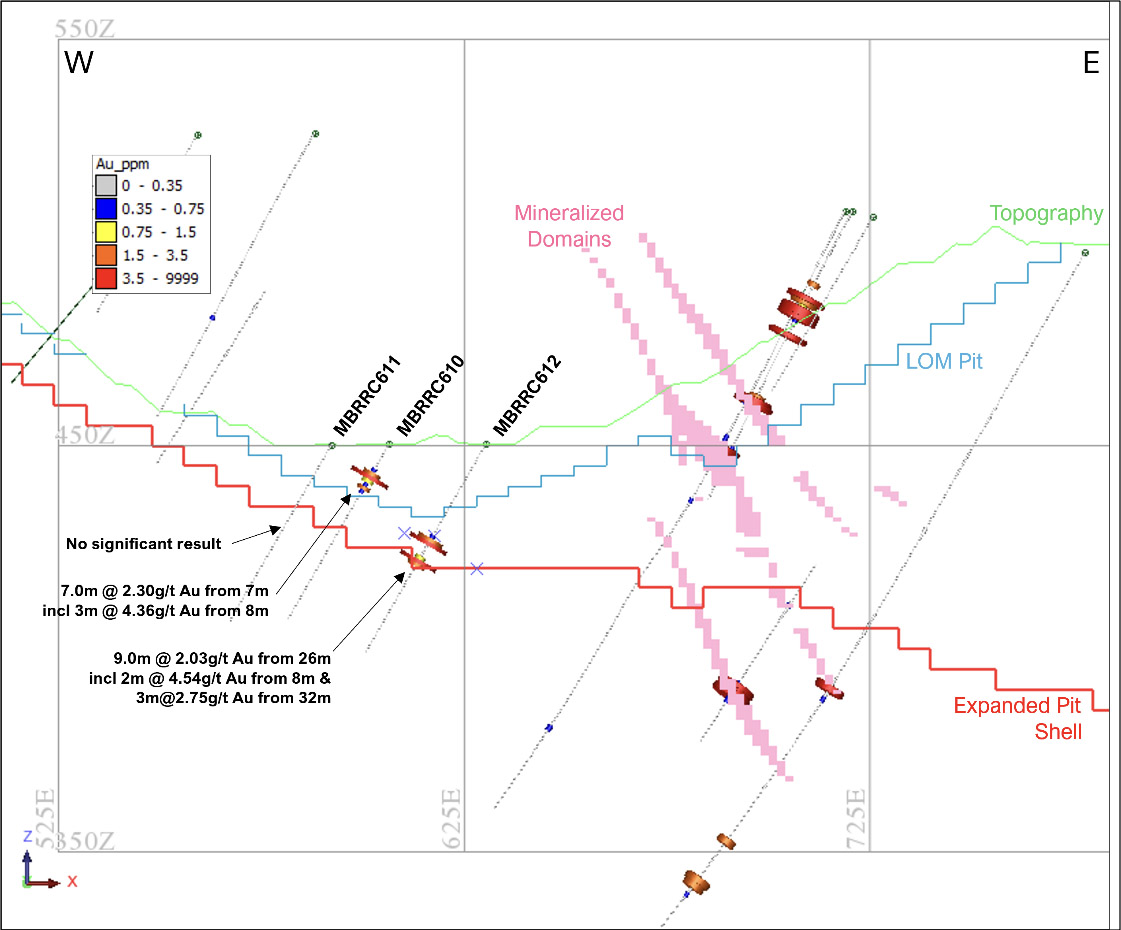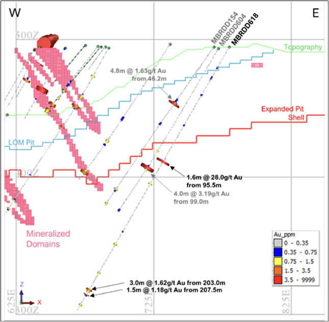 MBRDD616 and MBRDD619 intersected multiple gold mineralized zones at the lower boundary of the expanded pit shell and approximately 60m below the expanded pit shell (approximately 100m below the BRC3 current pit floor) (Figure 7). The area is sparsely drilled, open at depth and along strike. The deepest gold intersections in both holes potentially correspond to modelled mineralized domains approximately 80m to the north. The same mineralized domain was intersected by MBRDD600, MBRDD601 and MBRDD602 (Table 3)[2].