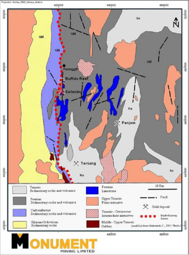 Vancouver, B.C., November 28, 2017, Monument Mining Limited (TSX-V: MMY and FSE: D7Q1) “Monument” or the “Company” is pleased to report significant results from its recently completed drilling program at the Peranggih Gold Prospect, located approximately 10 km North of the Selinsing Gold Mine (Figure 1). A close spaced 5m x 5m Rotary Air Blast (RAB) drilling program together with previous exploration has successfully delineated a zone of higher grade gold material, indicating that the mineralization occurs in the same regional shearing structure hosting Selinsing and Buffalo Reef deposits.