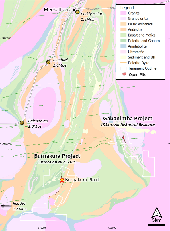 Figure 1: Geology map of the Murchison Gold Project showing locality of the Burnakura and Gabanintha tenements