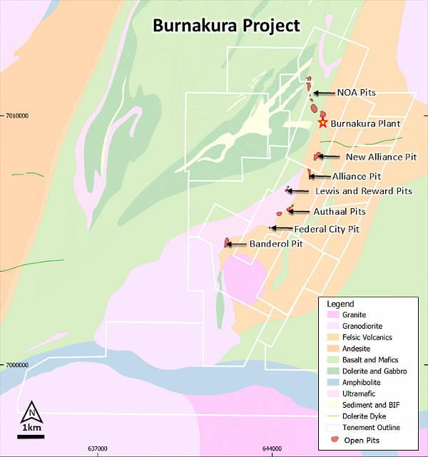 Figure 2: Basement geology map showing locality of the Burnakura tenements and open pit operations