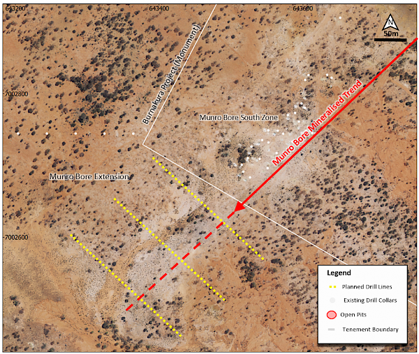 - Potential strike extension of the known gold mineralized system at Munro Bore to be tested within the Monument land holding.