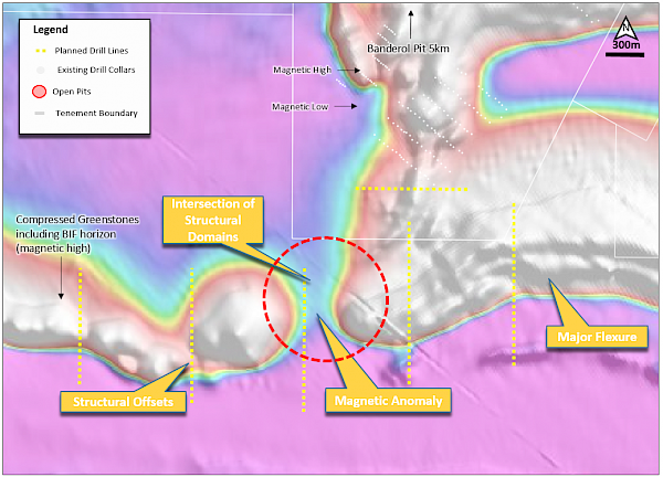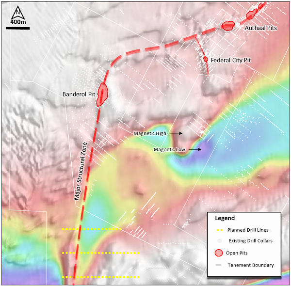 Figure 5: Aeromagnetic image showing Banderol N-S suture, Munro Bore NE-SW structural trend with planned AC drill lines at the Banderol South target.