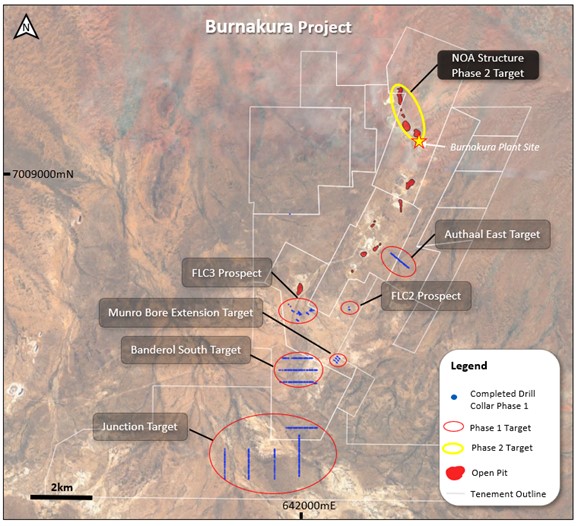 The second drill program will commence at a series of high potential targets identified on the Burnakura Project as shown in Figure 2. The program will focus on the NOA structure which is related to the regional Burnakura Shear Zone and is identified for 2.5km in a north-northwest direction. Open pit mines along this structure have produced significant ounces of gold from five deposits. Details of the drill program are presented in Table 1.