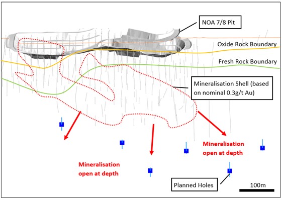 Figure 3: A long section looking west through NOA 7/8 showing target location of planned drill holes.