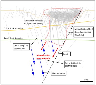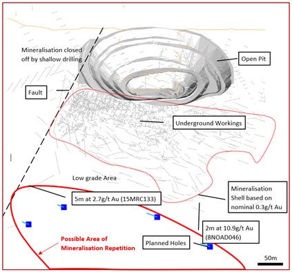 One RC hole for 170m is proposed to test the high-grade gold mineralization down plunge beneath the northern end of the pit.